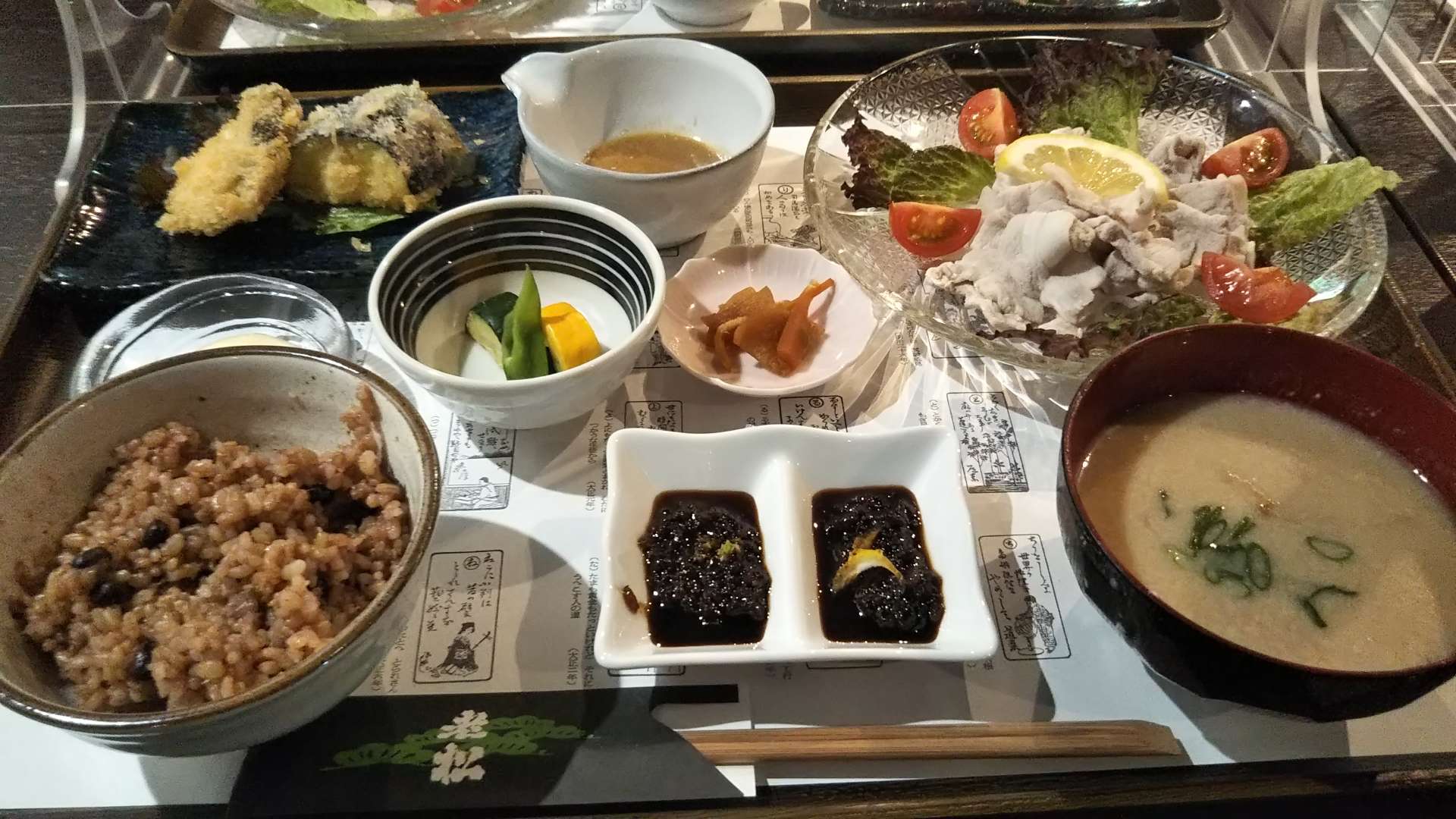 健康に良いと言われる発酵食品尽くしのランチは、玄米を圧力で炊き3日間発酵させた発酵玄米に、老松特製発酵ドレッシングでいただく野菜サラダ、山椒もろみや柚子もろみなど、すべてに発酵食や発酵調味料が使われています。