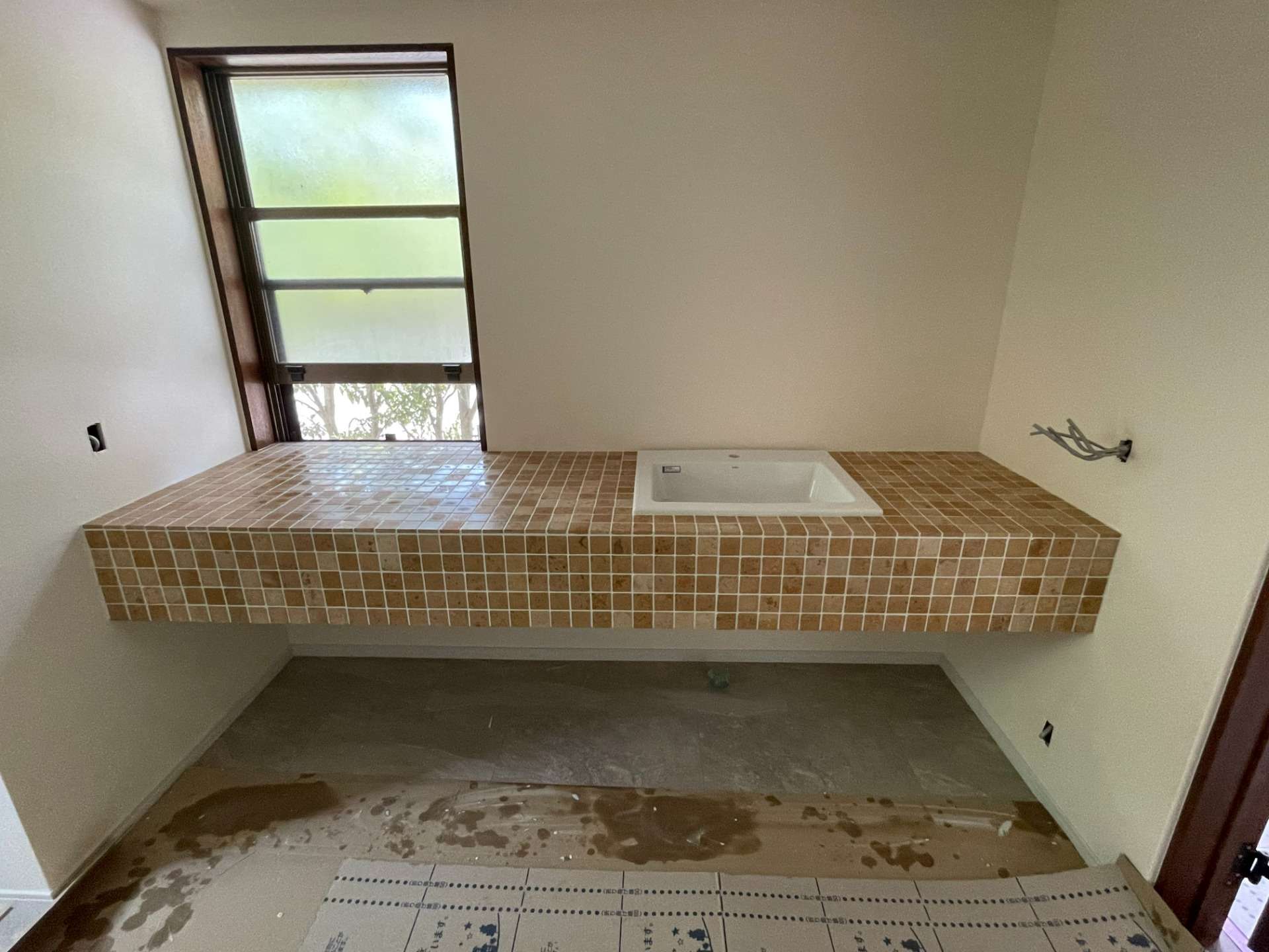 先週ご紹介した洗面カウンターの下地に、タイルを貼っていきます。