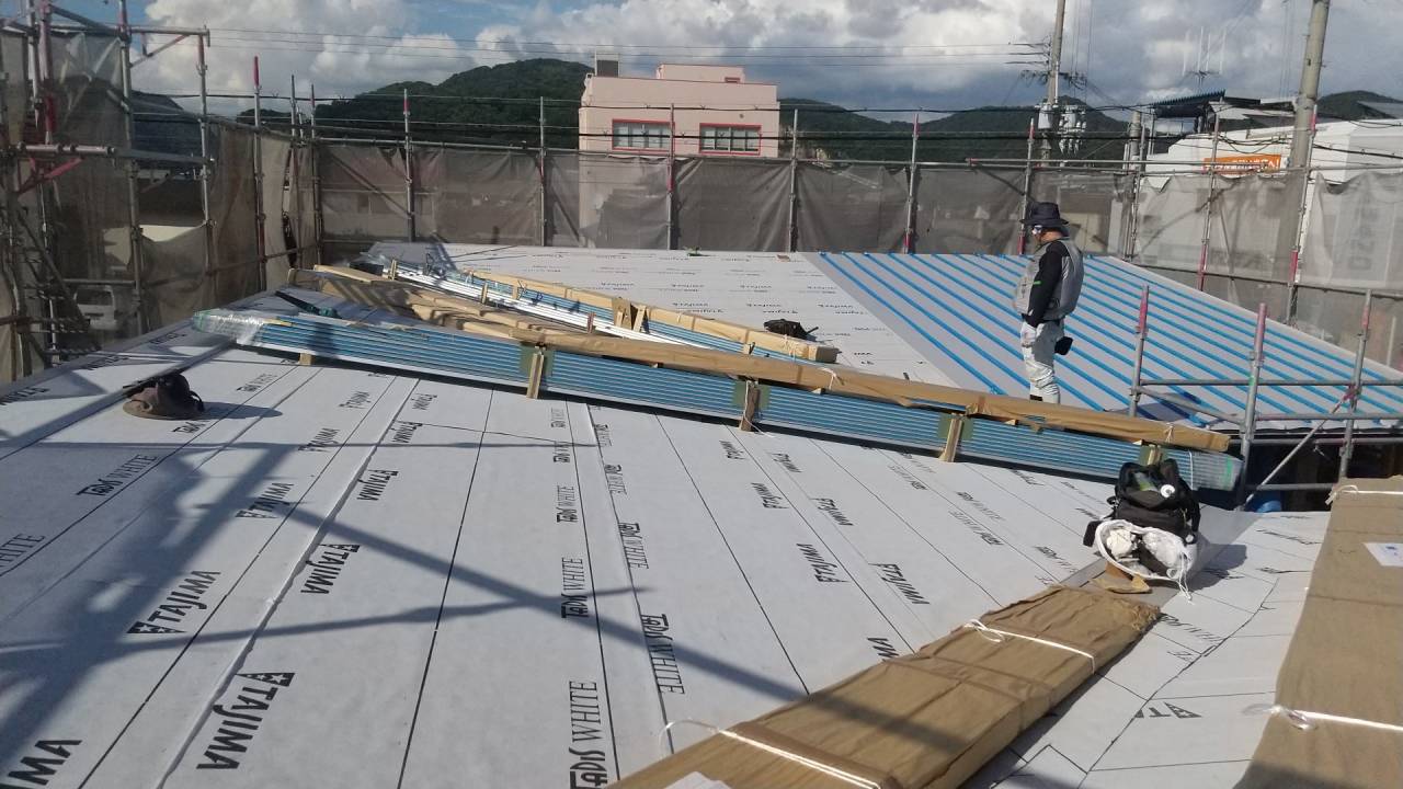 新築工事のご紹介です(^^)/ 2023/04/08 新築工事のご紹介です♪ 有限会社スローライフの工務部です( ^^) 前回、レッカーでの建て方作業が無事におわり次は屋根工事に入ります。 今回の屋根はガルバリウム鋼板の縦ハゼ葺きになります♪ 工場で継ぎ目の無いように現地の寸法に合わせて加工してきたものを施工していきます💪 暑い時期の工事だったので職人さん達は大変です💦 熱中症や事故が無いよう祈るばかりですm(__)m