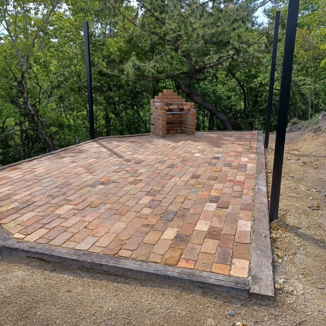 エクステリア工事のご紹介です♪ 2023/06/14 BBQスペースの工事のご紹介です♪ 有限会社 スローライフの工務部です(^^)/ 前回の投稿から日にちが空いてしまいました💦 今回は別荘地内のBBQスペースの続きです❕ 前回、耐火レンガ敷きの下地のコンクリートと土止めの枕木を設置してもらって今度は耐火レンガ敷きです。 人力で運び込んだことを思い出します・・・( ̄▽ ̄;) 奥のコーナーにはBBQコンロも作成しました(*^-^*) あとはタープを取り付けて完成です❕