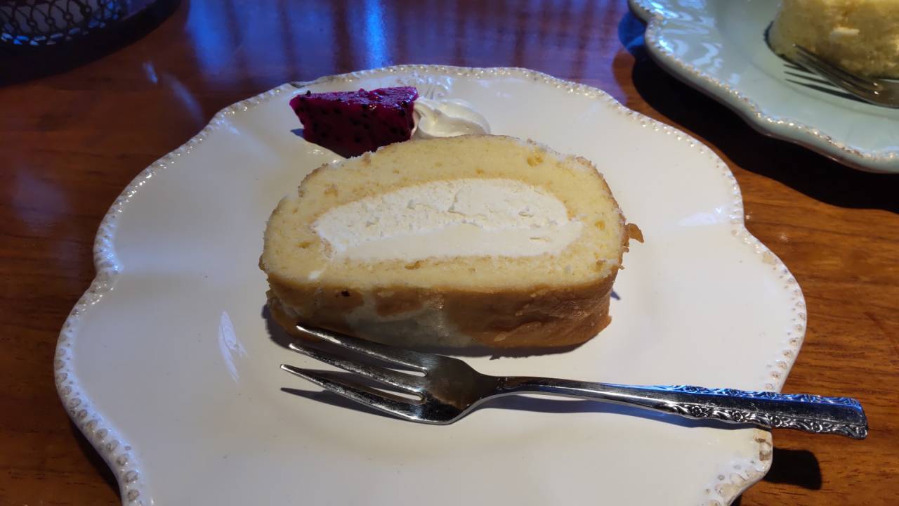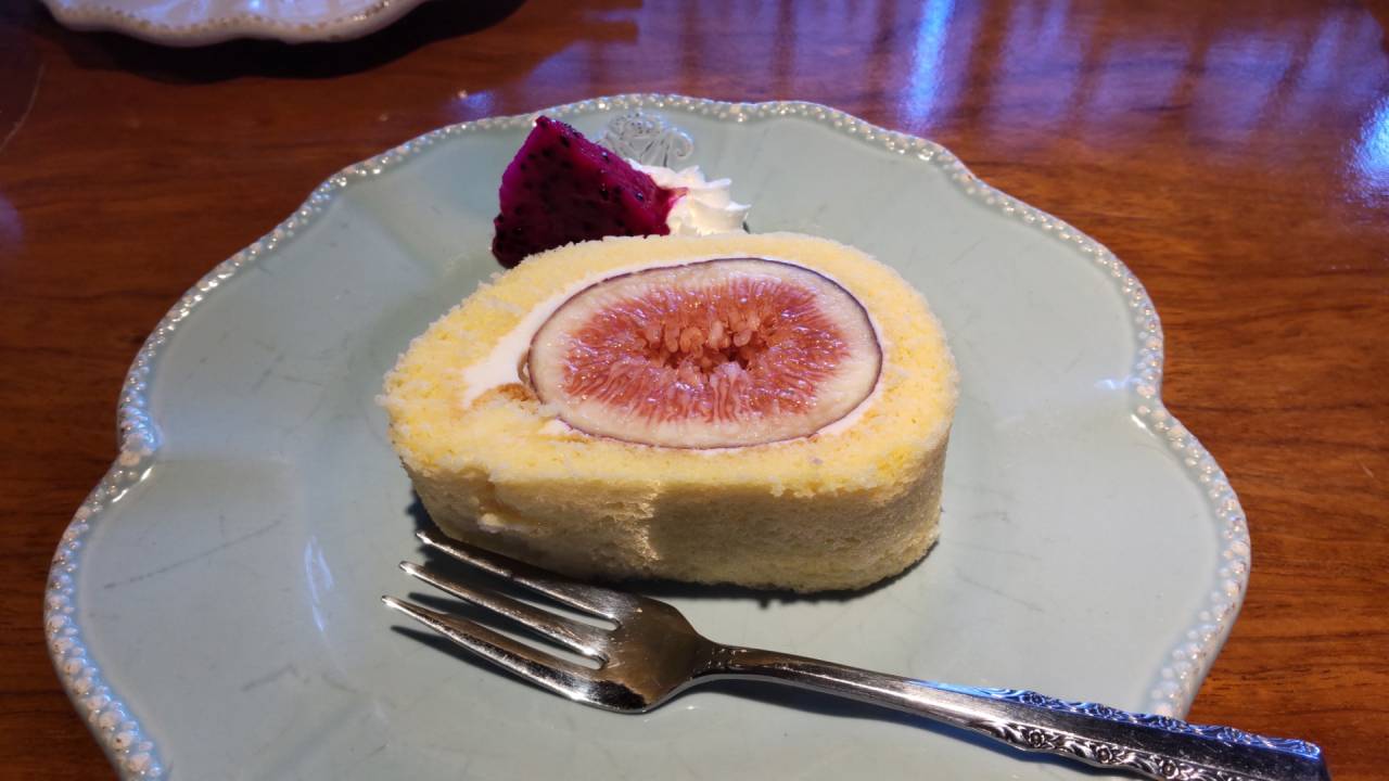食後のデザートを選んでいると、メニューには載っていないイチジクのロールケーキをオススメしてもらったので、たつの名産のお醤油を使った「お醤油ロールケーキ」と2種類のケーキをシェアしていただきました♪