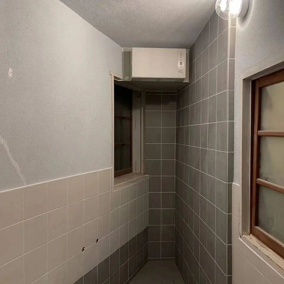 リノベーション工事のご紹介です! 2023/12/12 お風呂の工事の続きを紹介します〜 正面の壁の上の方にある穴、これは、暖房器具を付けるためのものです! タイル風呂の弱点は寒い事。 暖房器具で寒さを防ぎます😊 浴室暖房換気扇取付前 取付後