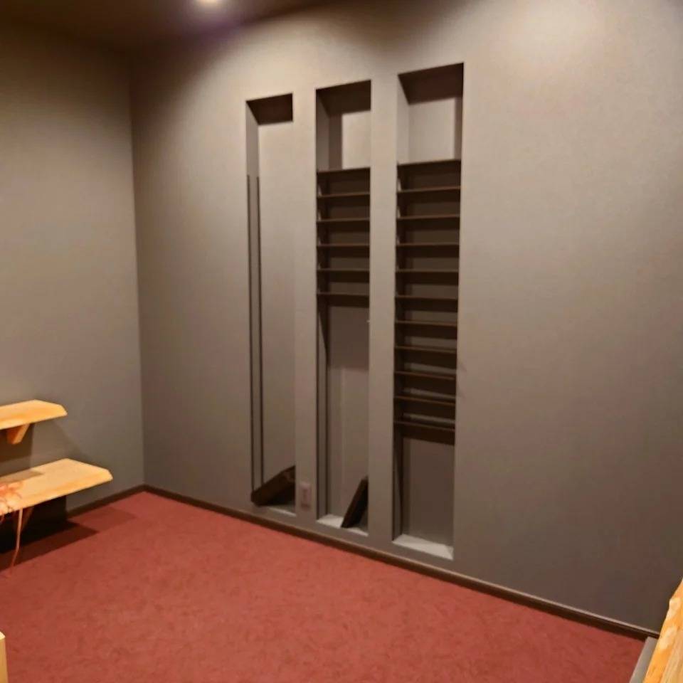 新築工事のご紹介です(^^)/ 2024/01/26 新築工事のご紹介です(^^♪ スローライフの工務部です(^-^) 突然ですがこちらの部屋はなんの部屋でしょう? 濃いグレーの天井壁に、床には赤いカーペット、、、。 奥の2段の無垢の杉カウンターには、こだわりのオーディオシステムが設置され、壁の棚には長年集めたDVDが並べられる予定です! そうなんです、シアタールームなんです! 夢ですよね~自宅に映画館があるなんて✨