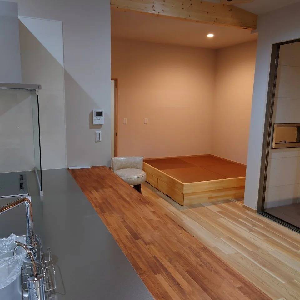 新築工事のご紹介です(^^)/ 2024/01/31 新築工事のご紹介です(^^)/ スローライフの工務部です! 今回はLDKの一角にある畳コーナーのご紹介です(^-^) こちらは通常の床の高さから腰掛けられるように1段あげて作ってあります。 仕上げは半畳の畳を敷いて、下にはワゴンを作って収納もバッチリです✨ 中庭側には折りたたみ式のカウンターも設置してこども達を中庭で遊ばせながら読書だってできちゃいます🎵 小さいスペースですが洗濯をたたんだり、赤ちゃんのオムツ交換をしたり大きくなったら宿題もそこでしてくれることでしょう(^-^)