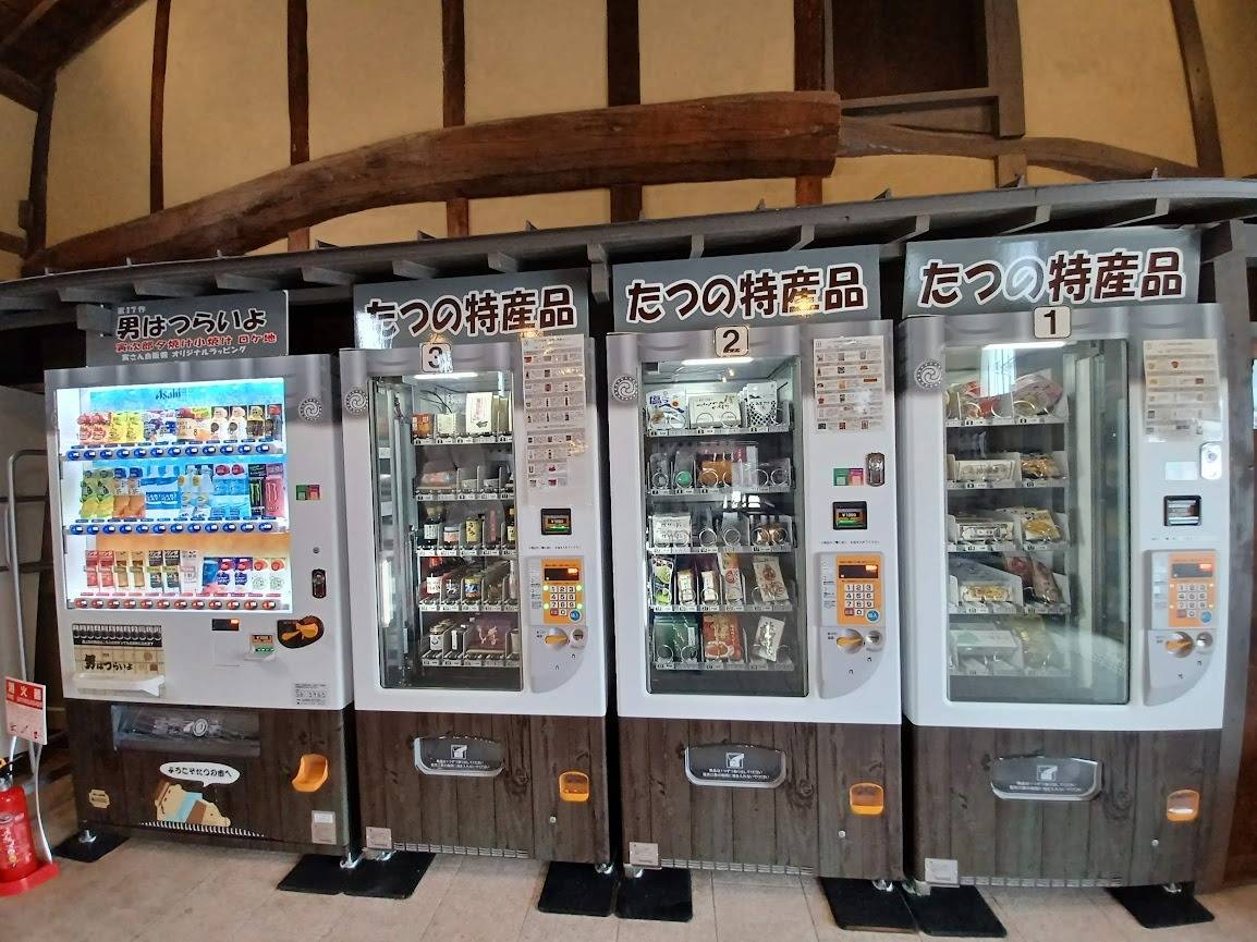 貴重な古い材料を生かして修繕されて継承され、再生・活用されていくのは素敵ですね。施設内には手延べそうめん「揖保乃糸」や淡口醤油、ペンケースなどの皮革製品など、たつのの地場産品が自動販売機で販売されていますよ!