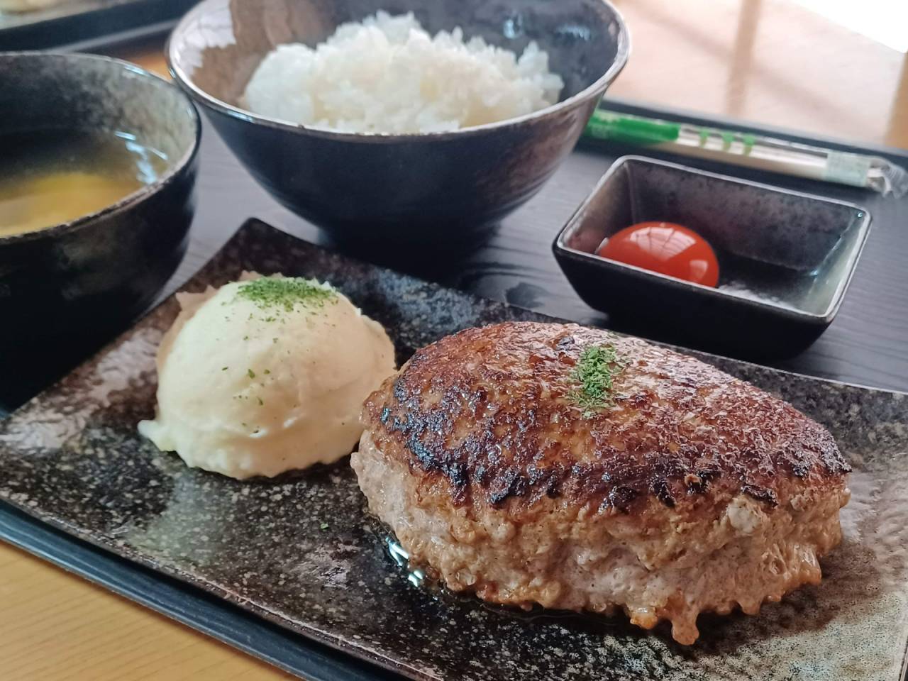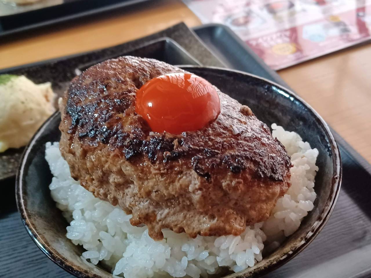 ハンバーグはボリュームたっぷり肉汁たっぷりでとてもジューシーです。ハンバーグをご飯に乗せて、お箸でハンバーグの真ん中をくりぬいてそこに卵黄を乗せて絡めて食べるのがおすすめの食べ方だそうです。