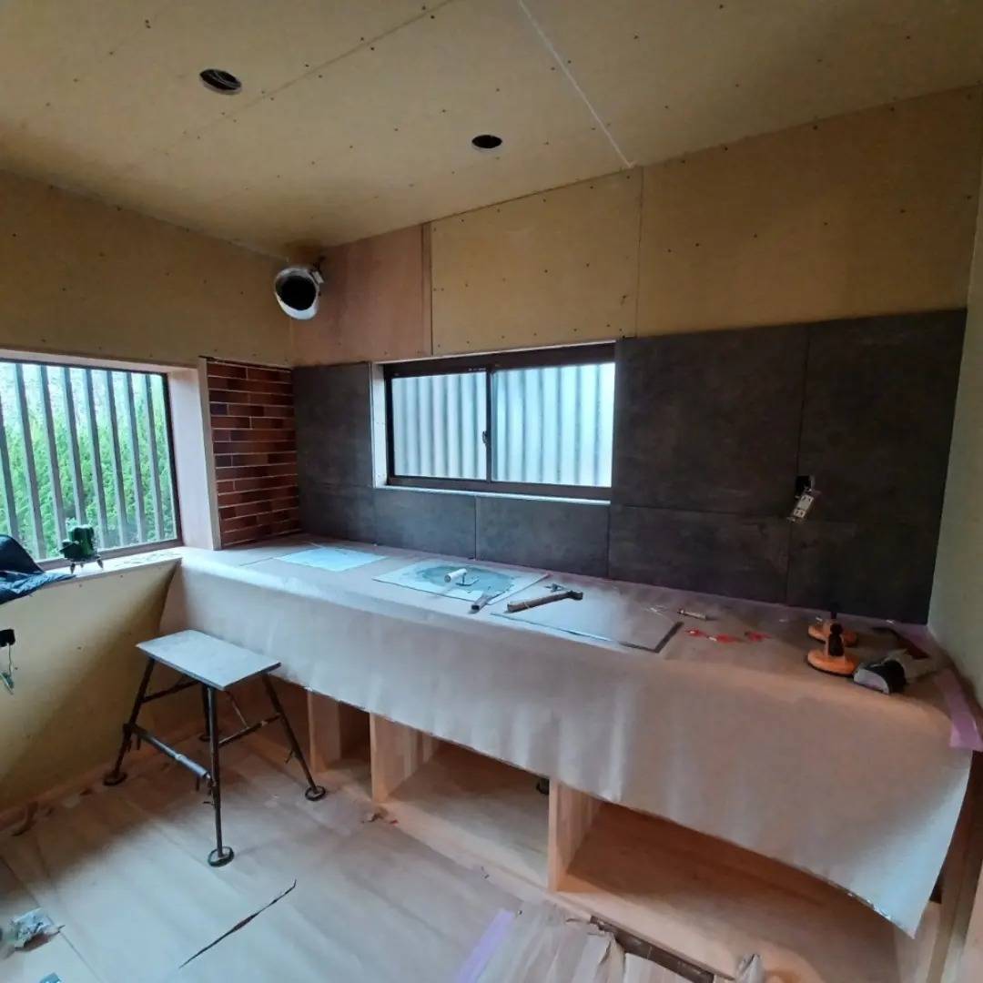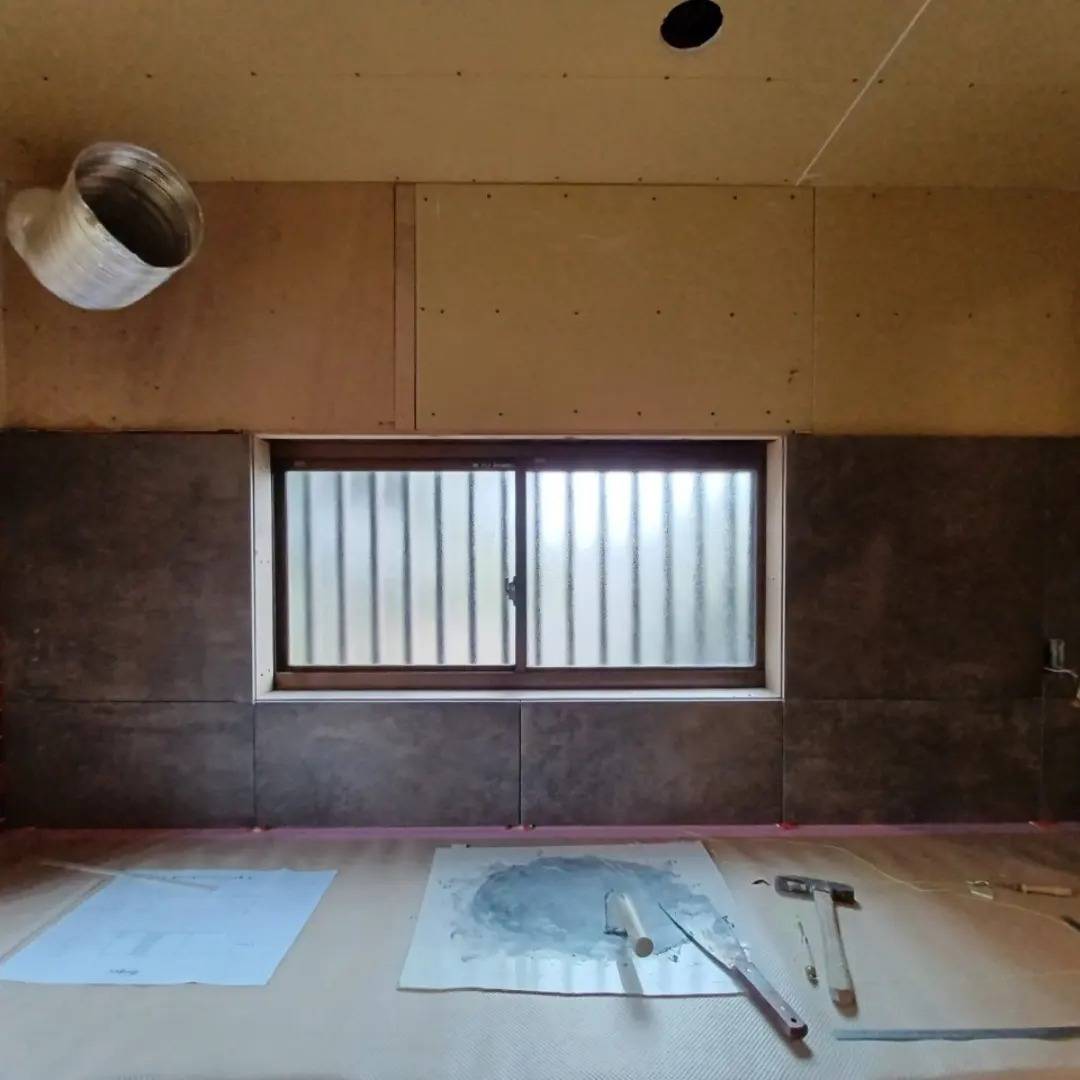 キッチンのカウンターの取付が終わり、タイルを貼っています!