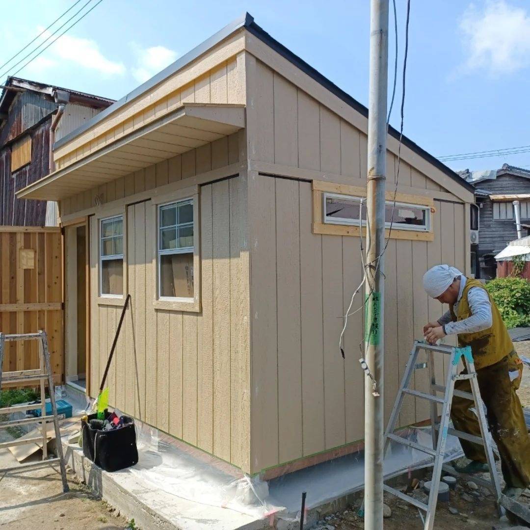 ミニハウス建て替え工事 2024/10/29 サッシや、庇の施工が完了したので、塗装を進めてもらいます!! これで外のメインの1つが終わりました〜 外のメインは、アプローチのタイル工事が待っています…o(^^)o