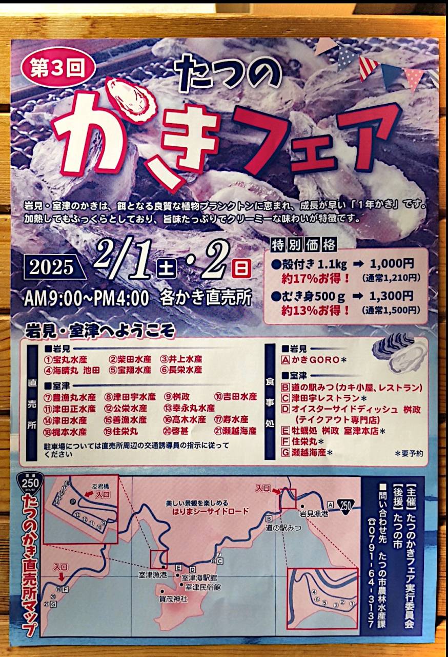 かきフェア♪ 2025/01/26 冬の楽しみのひとつが牡蠣です♪ 姫路、たつの、相生、赤穂、日生と播磨灘沿岸の漁港で気軽に新鮮な牡蠣が購入できるので、毎年何度かは買いに出かけるのですが、今年はまだ行けていません…。 播磨灘沿岸エリアではお得に牡蠣を購入できる牡蠣フェアが日を分けて開催されています! お得なフェアで買うか、人混みをさけて平日に買いに行くか迷うところですね~。 たつの市では2/1と2/2に開催されます♪ 物件をお探しの方はこちら♪