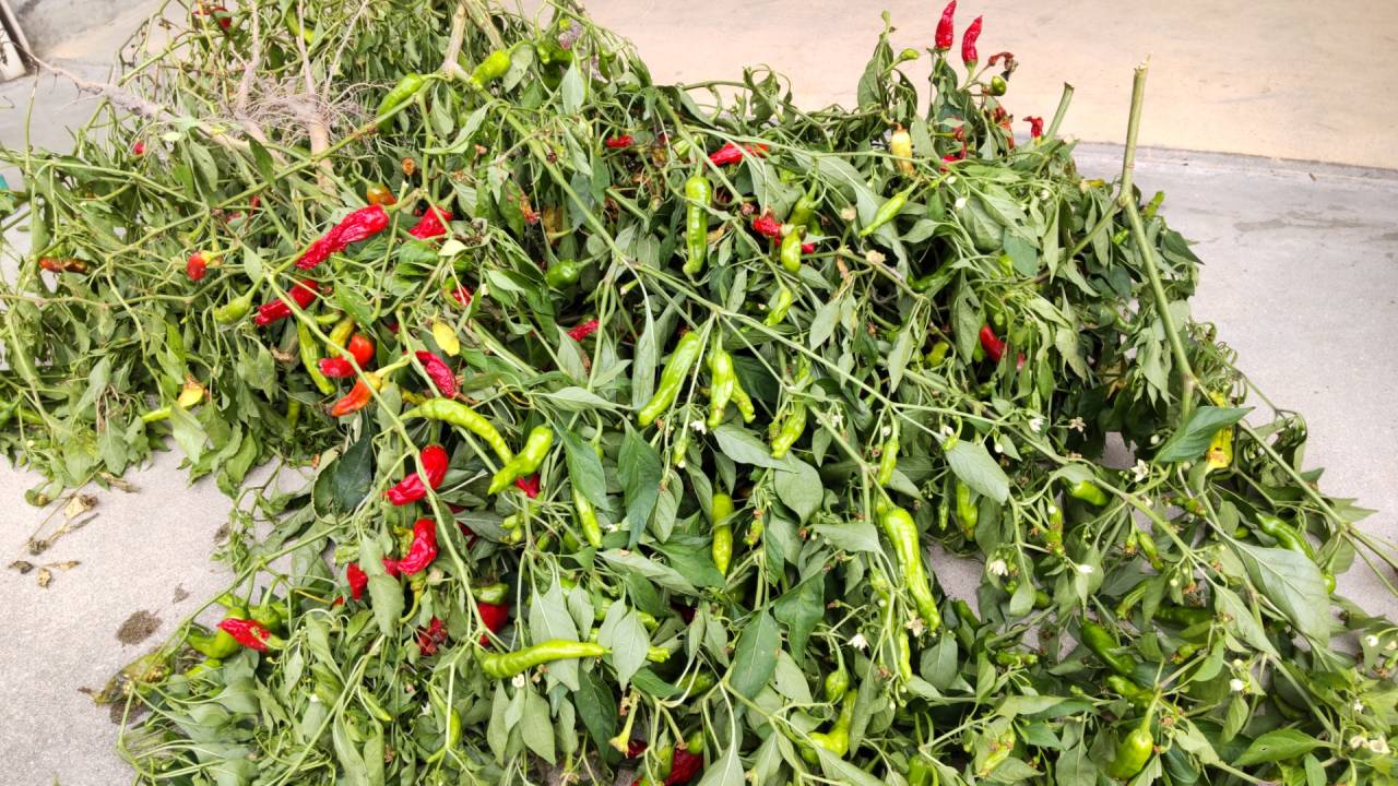 母の畑のシシトウです。 収穫時期も終わりになり、葉と実を佃煮にするために根っこから抜かれていました。 佃煮には使わないみたいですが、赤い実は熟しすぎたシシトウです。なんとなく赤い方が辛そうに…