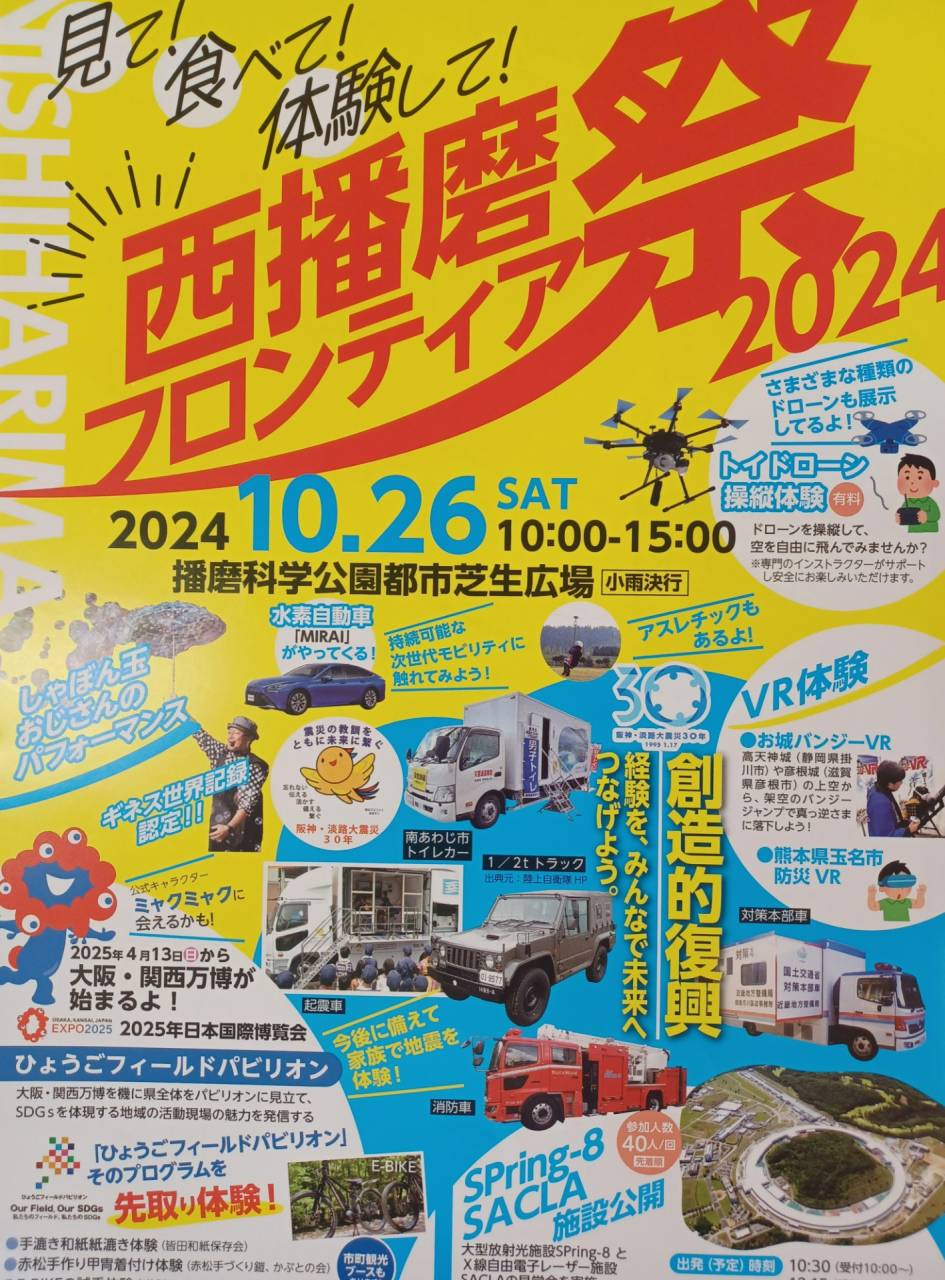 10月26日に播磨科学公園都市芝生広場で「西播磨フロンティア祭り2024」が開催されるそうです。VRやドローンの体験、ロボットの展示や実演、大型放射光施設SPring-8の施設公開など、面白そうですね!また…